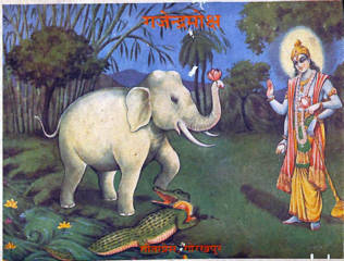 In the Gayandra Moksha Visnu liberates the leading white elephant Gayendra from the attacking crocodile and leads him to enlightenment.